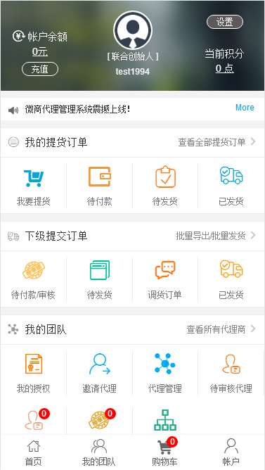 跳转到系统页面后,您可以进入账户页面完善收款/个人收件信息等操作。或者点击“我要提货”按钮进行下单。
